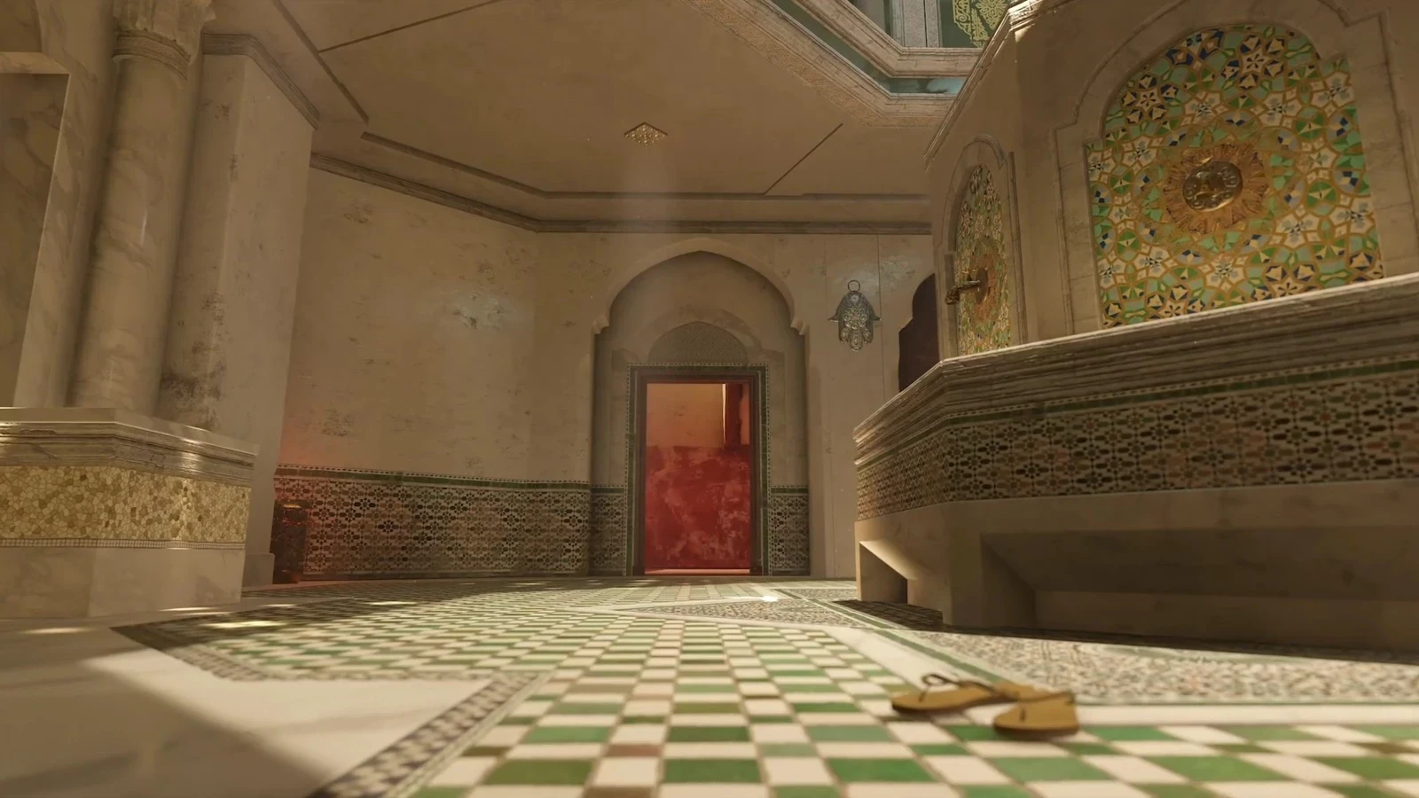 На бесконечных песчаных просторах стоит роскошное здание в арабском стиле. С каменных стен свисают зелёные растения, комнаты отделаны разноцветной плиткой, лепниной и деревом. В некоторых местах на полах расстелены мягкие ковры.