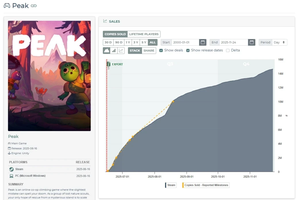 Обложка: скриншот игры PeakАналитики Alinea Analytics оценивают, что продажи кооперативного симулятора скалолазания Peak скоро достигнут 15 млн копий.