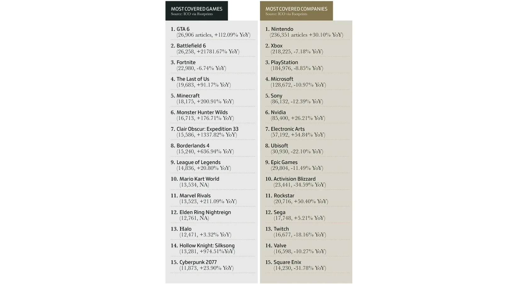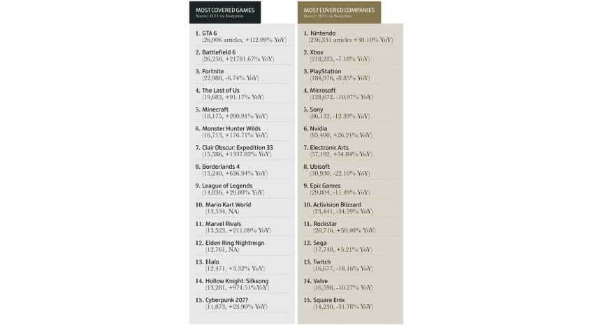 Например, чаще всего журналисты писали о Grand Theft Auto VI, Battlefield 6 и Fortnite. Как будто ничего неожиданного. А самыми популярными издателями стали Nintendo, Xbox и PlayStation — в таком порядке. Впрочем, в статистике упоминается только число материалов без эмоциональной оценки.