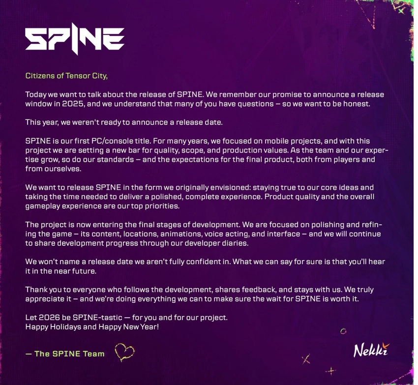 Авторы экшена Spine извинились за невыполненное обещание назвать дату релиза в 2025 году