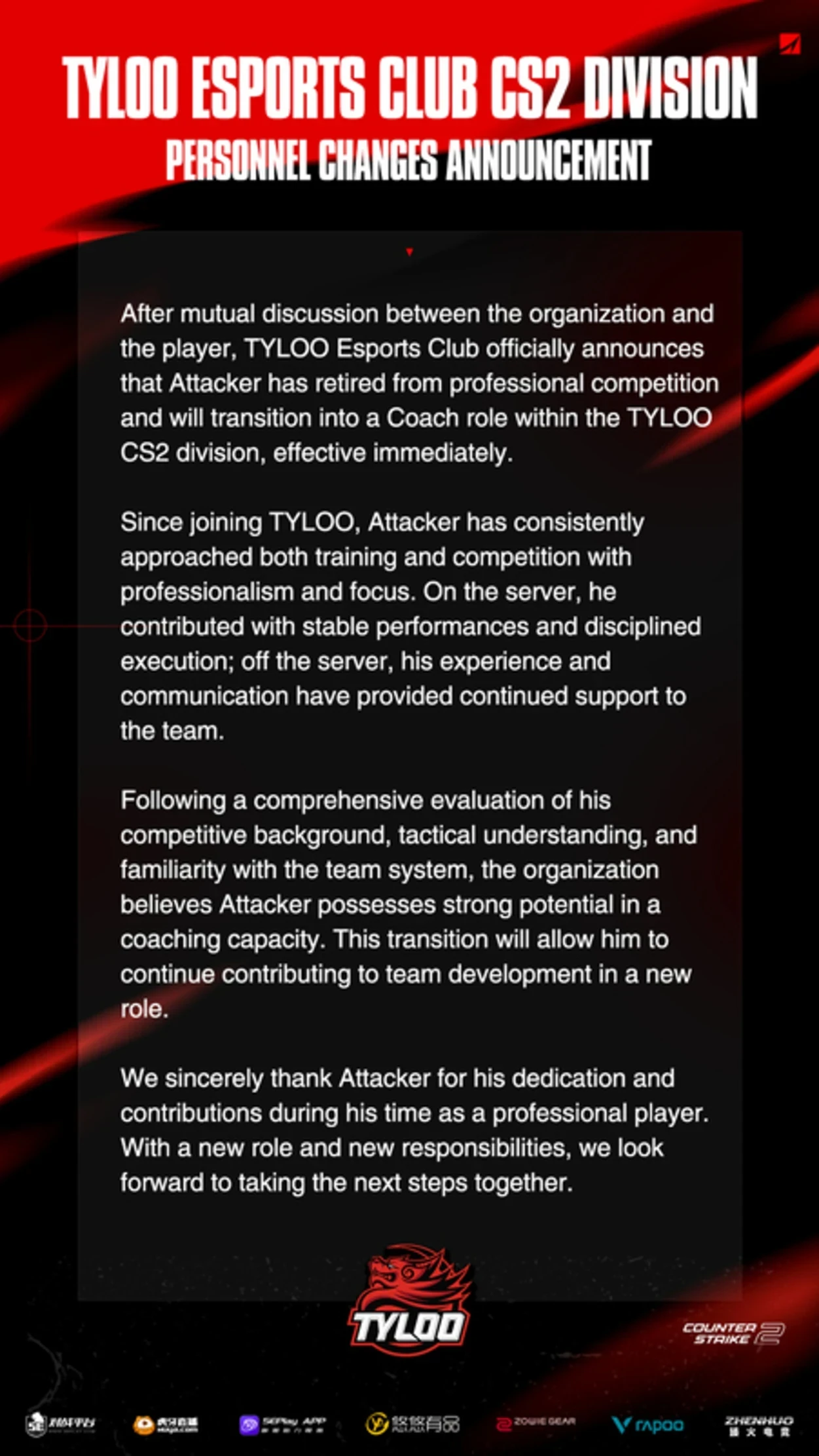 Ветеран китайской сцены Attacker завершил карьеру игрока в CS2 и стал тренером TYLOO