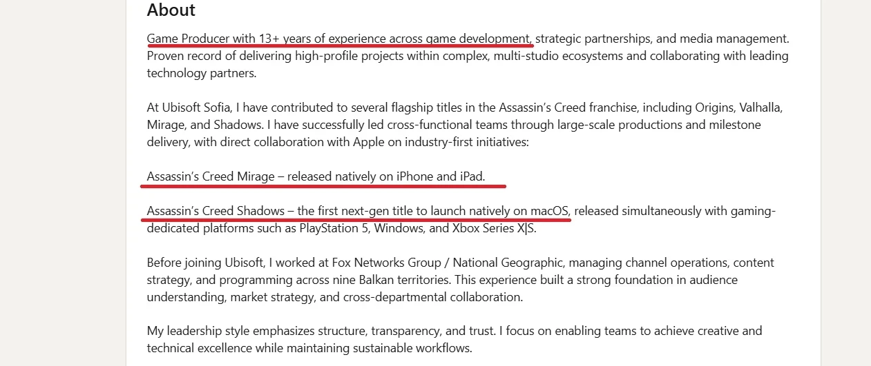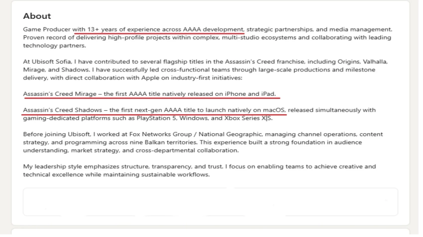 А теперь вот продюсер Ubisoft называет AAAA-играми Assassin’s Creed Mirage и Assassin’s Creed Shadows. Известный блогер Timur222 обратил внимание на LinkedIn-профиль Красимиры Яковлевой (Krasimira Yakovlieva), которая занимается франшизой Assassinʼs Creed в болгарской студии Ubisoft Sofia.
