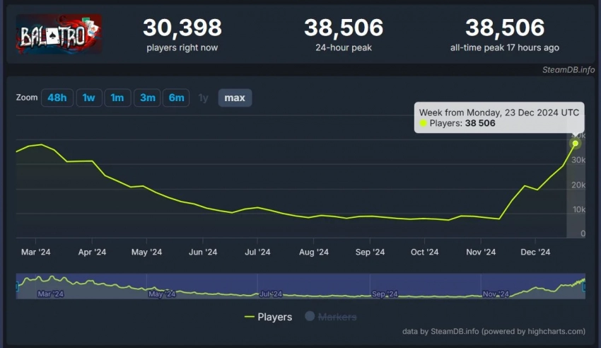 Ранее мы отмечали неожиданный всплеск популярности другой Steam-игры, The Forest. Но на него явно повлияли скидки рекордной щедрости — 90%. Что касается Balatro, то в зимней распродаже магазина цена игры снизилась всего на 10%.
