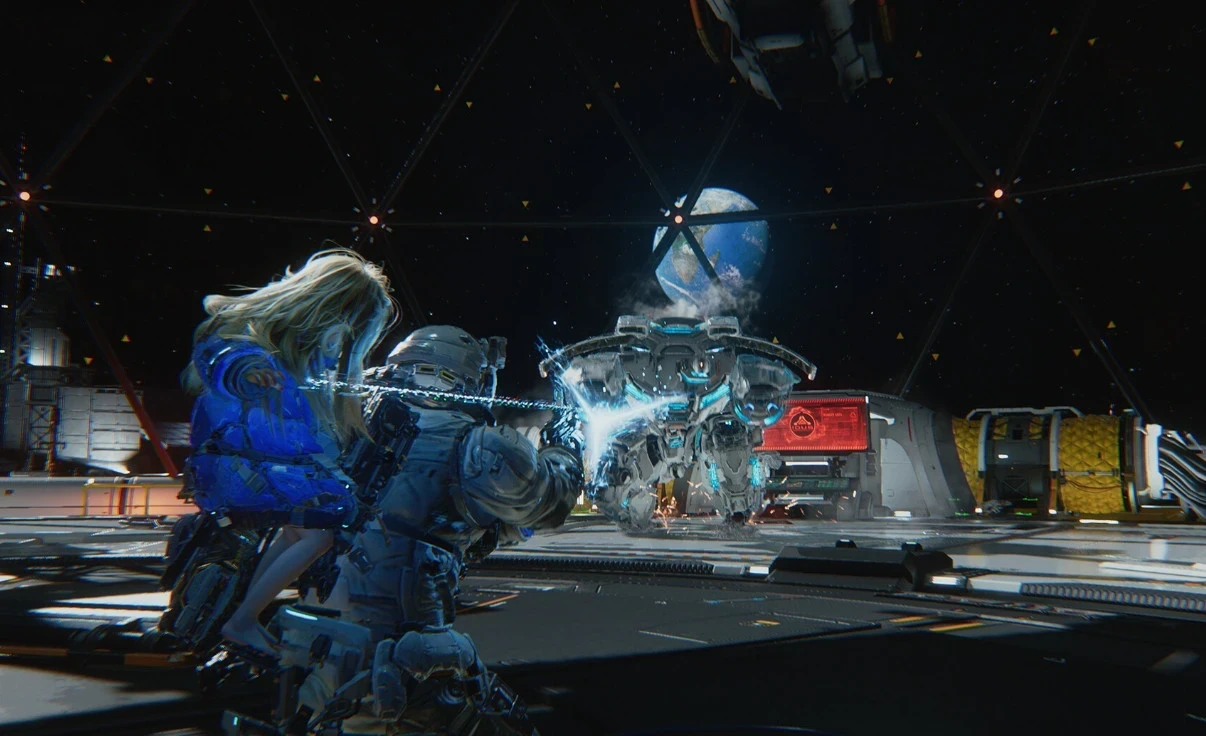 Взаимодействие Хью и Дианы не ограничивается одними лишь битвами. Например, при изучении локаций лунной базы главный герой может использовать двигатели для рывков и возможности зависнуть в воздухе. А вот маленькая спутница способна взламывать двери и даже открывать люки для входа в безопасные зоны.