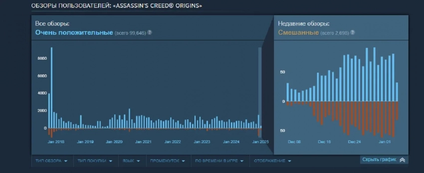 За последние 30 дней лишь 60% пользовательских обзоров на Assassin’s Creed Origins оказались положительными. Многие из них написаны совсем недавно и совпали с зимней распродажей в Steam — геймеры не наиграли и часа, но оставили негативный отзыв.