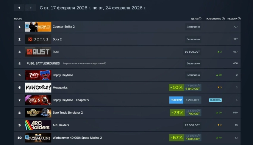 Также в топ-10 есть кое-что необычное. В чарт вернулась условно-бесплатная Poppy Playtime, занявшая седьмую строчку. Всё благодаря выходу платной пятой главы, которая прибыла в хоррор 18 февраля и оказалась на девятом месте. Да, ей удалось обогнать эвакуационный шутер ARC Raiders.