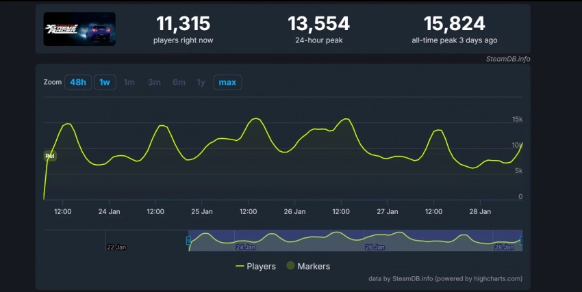 Что касается пикового онлайна, то он составил более 15 тысяч игроков. При этом спустя пять дней после выхода в раннем доступе Tokyo Xtreme Racer удерживает аудиторию — в момент написания новости в гонке находится свыше 11 тысяч геймеров. Для сравнения, Need for Speed Unbound на пике привлекла лишь 14 тысяч геймеров.