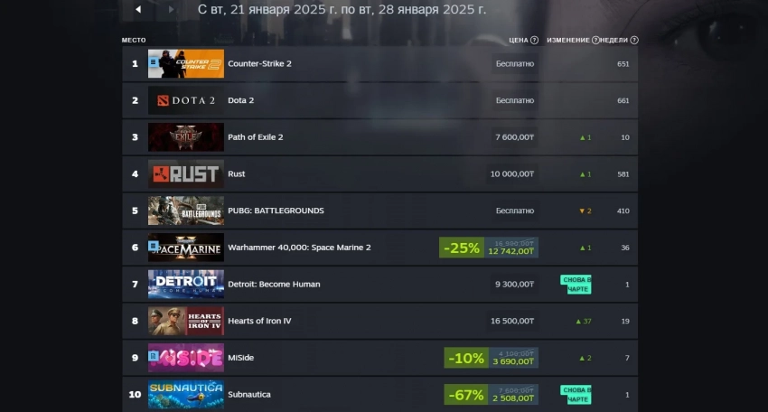 Закрывает первую десятку выживалка Subnautica, а впереди неё идёт нашумевшая MiSide за авторством отечественных разработчиков. Также на шестом месте стоит отменить брутальный экшен Warhammer 40,000: Space Marine 2, который получил скидку в 25% от стандартной цены.