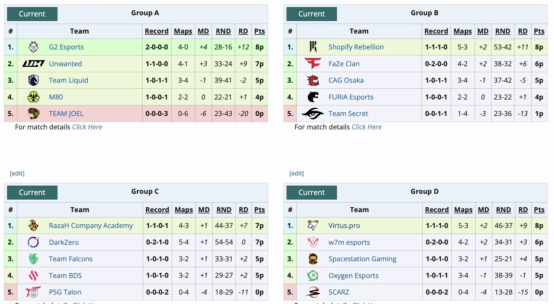 Virtus.pro по-прежнему сохраняет лидерство в своей группе. Что касается других пятерок, то группу А возглавляет G2 Esports, в группе В на первом месте Shopify Rebellion, а в группе С лидирует RazaH Company Academy.