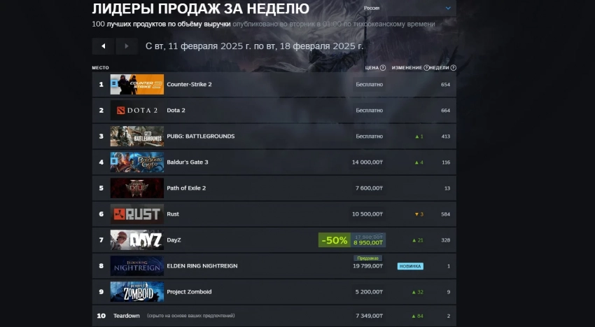 Топ продаж игр в Steam по выручке с 11 по 18 февраля