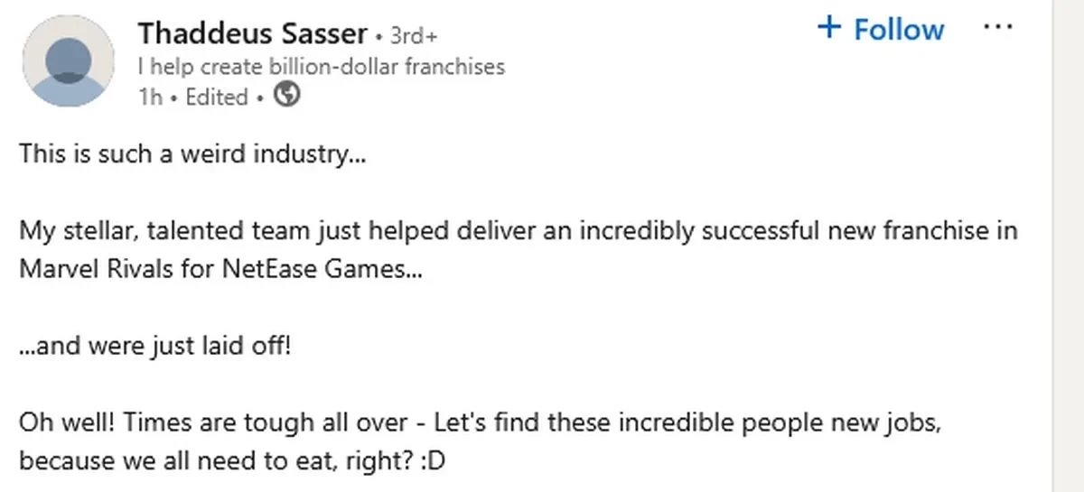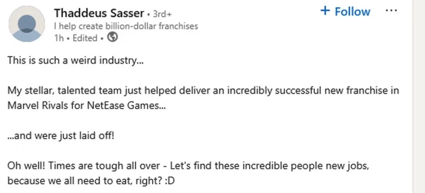 Как сообщил геймдиректор Marvel Rivals Таддеус Сассэр, компания NetEase Games уволила его и всю лос-анджелесскую команду онлайнового шутера. Его сообщение подтвердил дизайнер уровней Джек Барроуз, а в сообщении Сассэра упоминается ещё один дизйнер уровней, Гэрри МакГи.