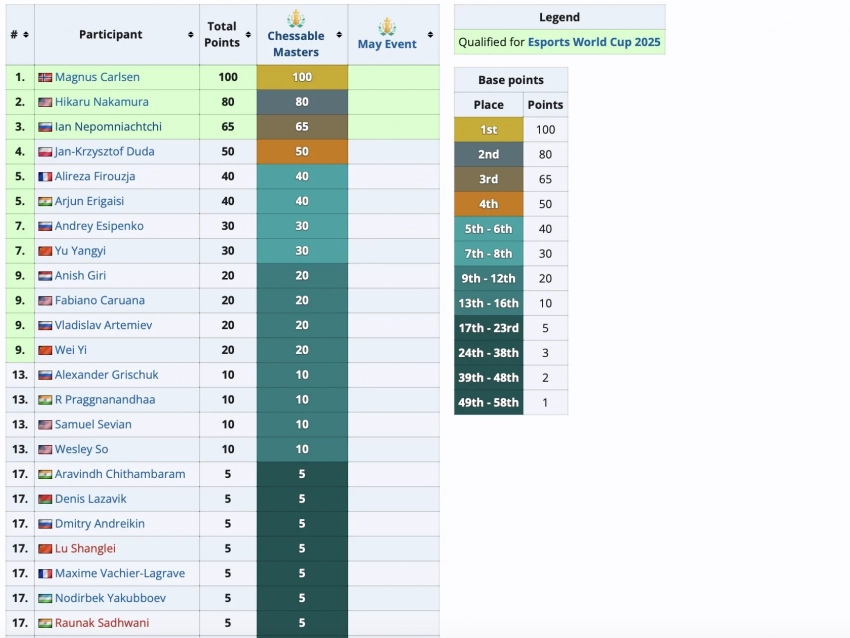 Первое место в рейтинге занимает Магнус Карлсен, который одержал победу в шахматной квалификации. Отметим, что вместе с ним на турнир прошел и Хикару Накамура, который занял второе место в отборочных.
