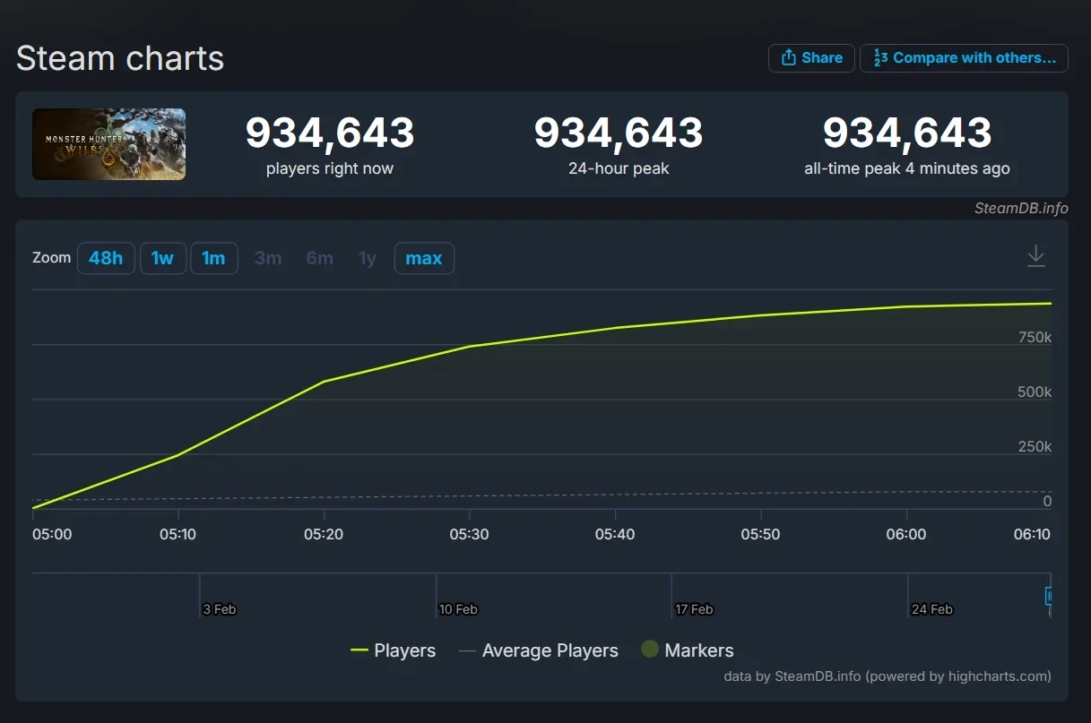 Пиковый онлайн Monster Hunter Wilds в Steam приблизился к 1 млн игроков одновременно