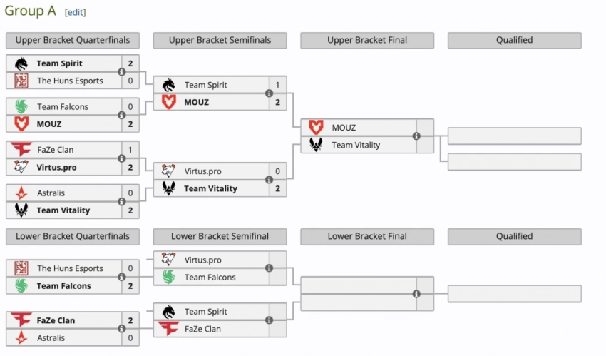 Их соперники Team Spirit и Virtus.pro опустились в финал нижней сетки. Virtus.pro сыграет с Team Falcons, а Team Spirit встретится с FaZe Clan.