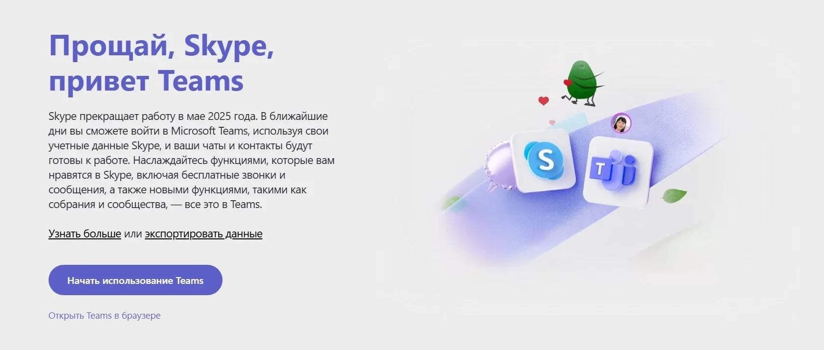 Пользователи Skype смогут перейти на Бесплатную версию Microsoft Teams, которая предлагает многие из основных функций и многое другое. Войдите в бесплатную версию Microsoft Teams на любом поддерживаемом устройстве, используя свои учетные данные Skype, и ваши контакты и чаты будут автоматически перенесены. Вы также получите уведомление в приложении Skype с предложением выполнить действия по переносу данных.
