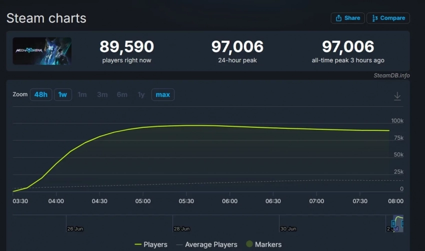 Тем временем пиковый онлайн Mecha Break в Steam достиг 97 006 игроков одновременно. При этом во время февральской беты шутер привлёк 317 тыс человек одновременно! Наигрались?