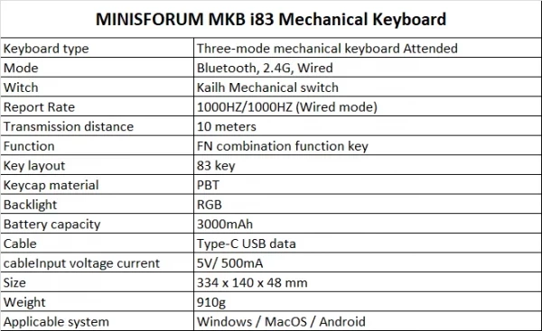 MINISFORUM MKB i83 — это клавиатура, сочетающая в себе элегантность, производительность и универсальность. Он предназначен для геймеров, профессионалов и всех, кто требует совершенства от своих периферийных устройств.