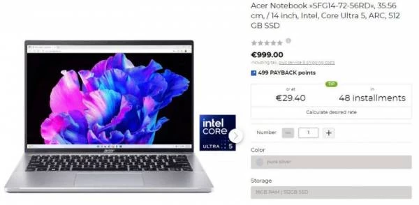 Наиболее подробные характеристики различные продавцы указывают для будущих моделей ноутбуков Acer. Например, согласно немецким ретейлерам Baur и Otto, из наиболее доступных вариантов производитель предложит обновленные модели лэптопов Swift. Например, базовая версия ноутбука Acer Swift (SFG14-72-56RD) оснащена процессором Core Ultra 5 125H с частотой от 3,3 до 4,5 ГГц, 16 Гбайт памяти LPDDR5X и твердотельным накопителем объёмом 512 Гбайт. Новинка предложит 14-дюймовый OLED-дисплей с разрешением 2880 × 1800 пикселей. И всё это за 999 евро ($1088).
