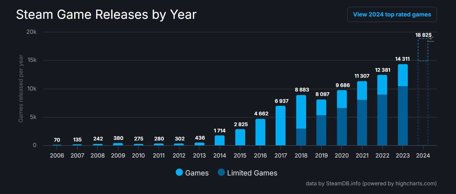 За 2024 год в Steam вышло 18825 игр — внимание на статистику обратили на DTF. Для сравнения, в 2023 году на площадке появилось чуть более 14 тысяч новинок, тогда как в 2020 году число не могло добраться и до десяти тысяч. Однако у рекордного числа есть важный нюанс — большинство из выпущенных игр до сих пор имеют «ограниченный» функционал из-за своей низкой популярности.