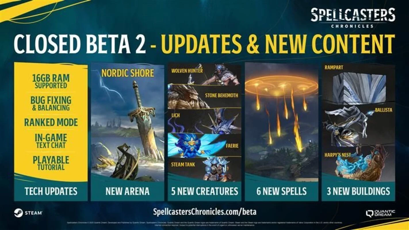 Также уделили внимание и контенту. Ко второму закрытому тесту в игре стал доступен новый регион, пять новых существ и шесть заклинаний. Закрытая бета доступна в Европе, Северной Америке и Азии, но в некоторых регионах может быть повышенная задержка. Русского языка в игре нет.