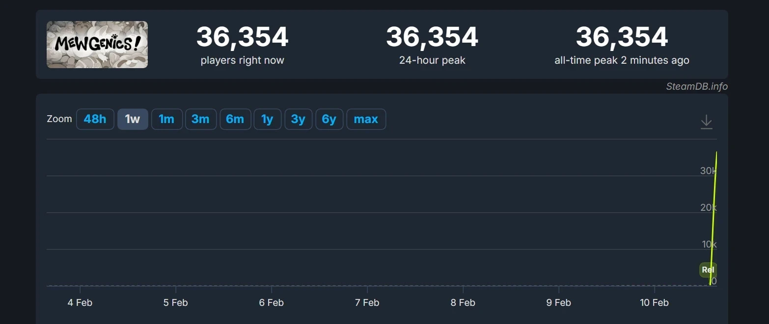 Пиковый онлайн Mewgenics в Steam уже превысил 36 тысяч человек и потенциально вырастит в ближайшие часы. Игра уже смогла обогнать оригинальную версию The Binding of Isaac (12,5 тыс. человек на пике онлайна), однако до обновлённой The Binding of Isaac: Rebirth (70 тысяч геймеров на пике) ещё далеко.