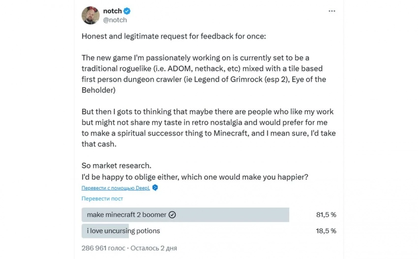 Перссон предложил игрокам самим решать, за что они готовы заплатить: за ретро-рогалик или за Minecraft 2. Пока что голоса в голосовании явно склоняются ко второму варианту: за «уютный открытый мир» без наказания за ошибки выступает 81,5% игроков. А Notch уверяет, что поступит именно так, как скажет ему аудитория, поскольку он просто любит делать игры, и ему не особенно важно, какие именно.