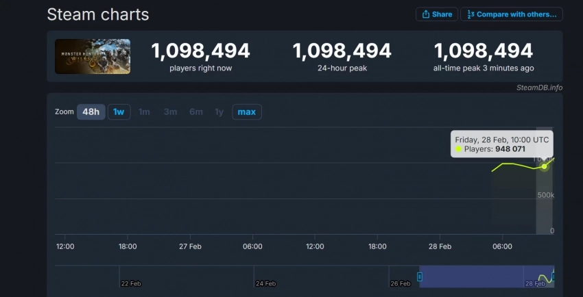 Самое интересное о кино на YouTube канале Игромании!Обложка: скриншот Monster Hunter WildsВозвращаемся к новостям Monster Hunter Wilds. Утренний рекорд по пиковому онлайну ролевого экшена в Steam был побит — в момент написания новости в игре находится свыше миллиона человек. Потенциально число может значительно вырасти — впереди вечер и выходные.