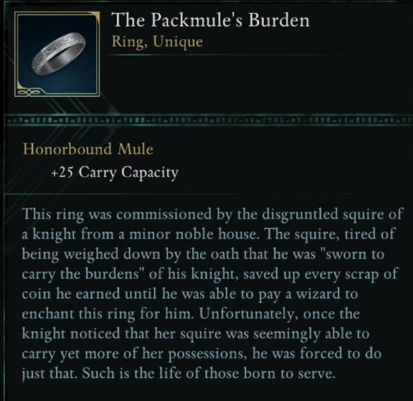 Да, про него не забыли и разработчики Avowed. Маленькая, но приятная отсылка кроется в уникальном колечке The Packmule’s Burden («Ноша вьючного мула»). Описание рассказывает об оруженосце, который поклялся нести ношу своего лорда. Он с трудом накопил на зачарованное кольцо, позволяющее увеличить тяжесть инвентаря, однако этим с удовольствием воспользовался лорд.