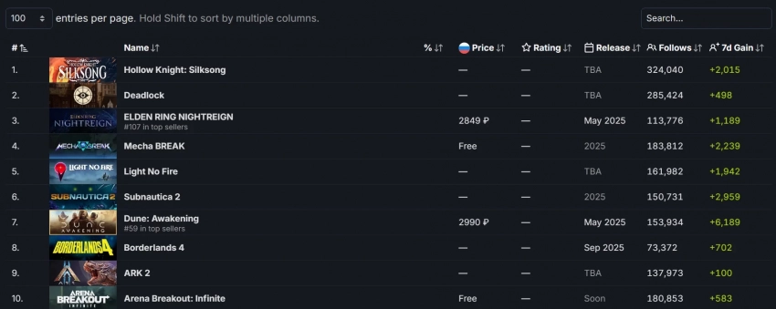 В данный момент Silksong опережает Deadlock (шутер Valve) и Elden Ring Nightreign, которая выйдет в конце мая. Согласно базе данных Steam, за последнюю неделю сообщество заинтересованных в многострадальной метроидвании игроков пополнилось на ещё две тысячи человек. Всего же у игры более 324 тысяч подписчиков — на данный момент это рекорд среди невышедших игр.