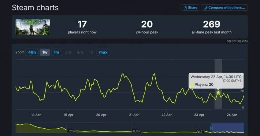 Chernobylite 2 вышла в раннем доступе в Steam в марте — именно тогда игра достигла пикового онлайна в 269 человек. С того момента число игроков стремительно упало. Выход крупного обновления 16 апреля лишь ненадолго привлёк 47 геймеров на пике — аналогичное значение наблюдалось лишь 24 марта. В последние дни онлайн вновь стал снижаться. Например, 23 апреля пик Chernobylite 2 составил лишь 20 игроков.