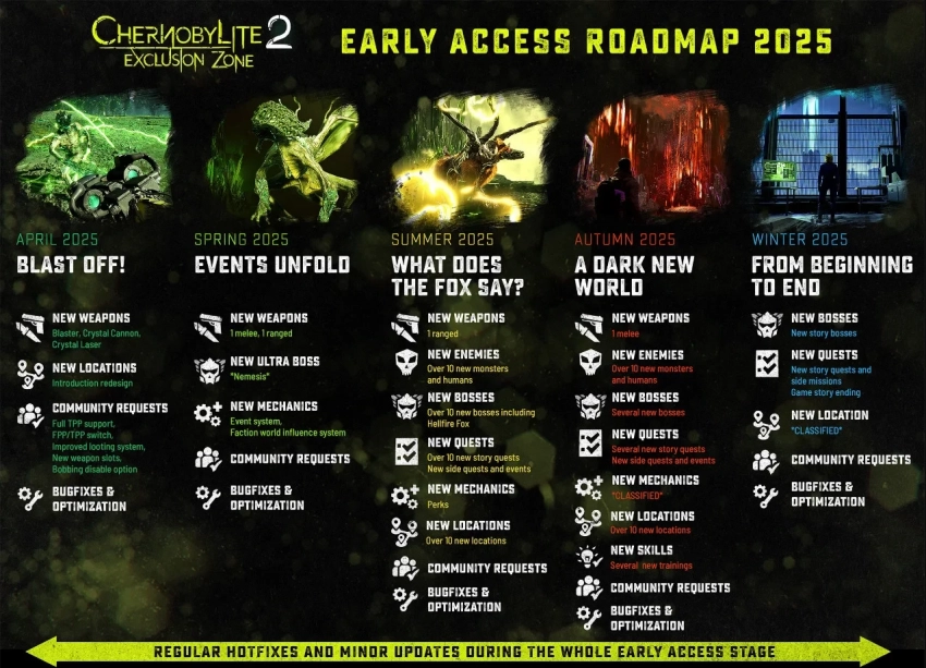 The Farm 51 поделилась планом обновлений в раннем доступе на 2025 год. До конца весны в Chernobylite 2 должны появиться новые виды оружия и ультра-босс, а также механики событий и влияния фракций на мир игры. Летом же поклонников ждут новые локации, противники, боссы и задания — аналогичный набор намечен на осень. О зимних новинках известно не так много, но это точно будут новые квесты, боссы и некая локация.