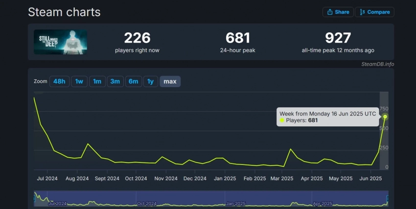 Увы, релиз дополнения не помог Still Wakes the Deep побить собственный рекорд пикового онлайна. Однако DLC однозначно привлекло внимание игроков — на пике за 24 часа в хорроре находился 681 человек. Подобных показателей игра достигала лишь в первые дни после релиза, а её рекорд пикового онлайна в целом составил 927 человек.