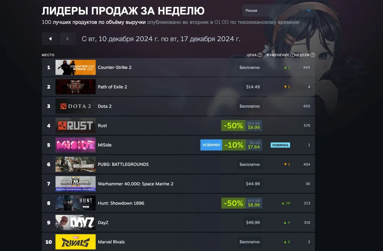 Первое место CS2 заняла и в топе России, а единственной новинкой подборки оказалась ролевое приключение с элементами хоррора MiSide (5 место).