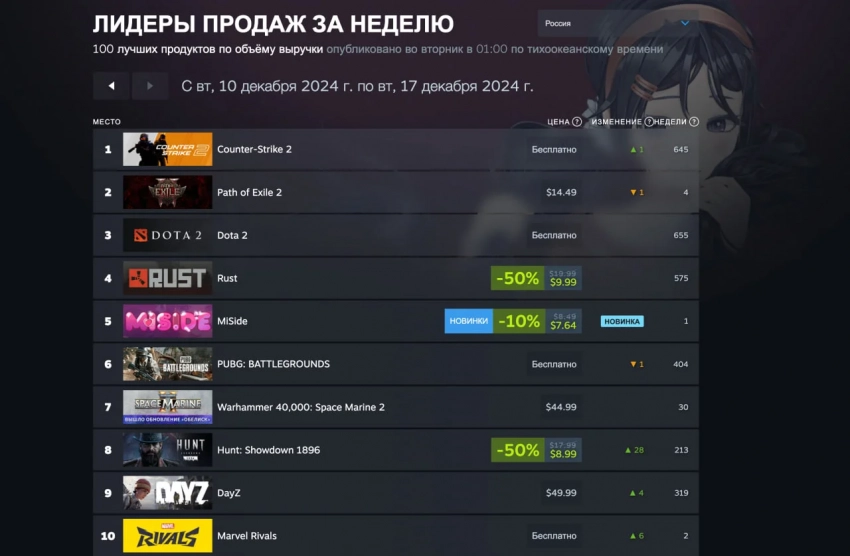 Лидеры продаж Steam с 10 по 17 декабря